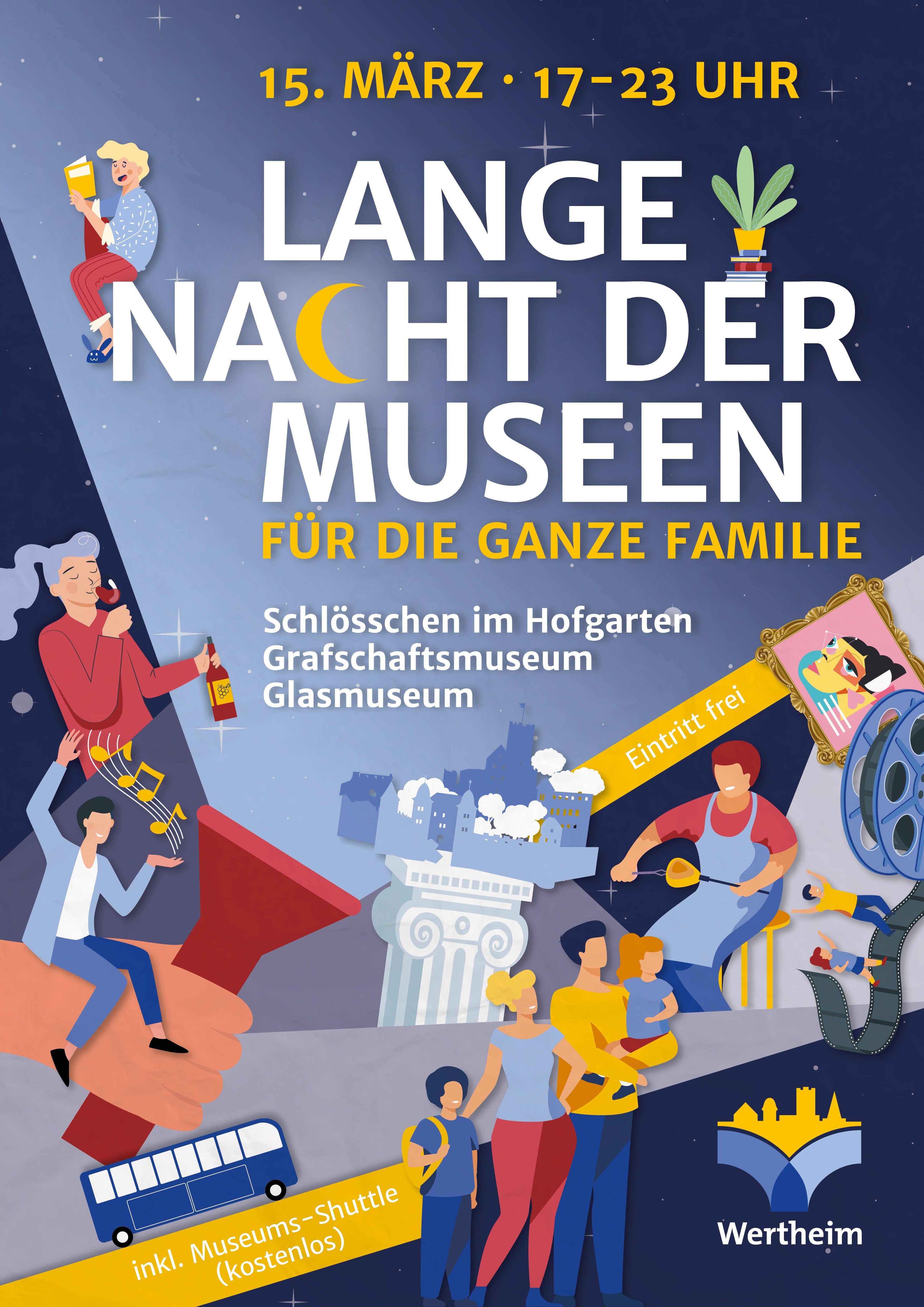 Am Freitag, 13. März 2026 findet erneut in Wertheim die Lange Nacht der Museen statt. Im Rahmen des Förderprogramms "Zukunftsfähige Innenstädte und Zentren" hat man sich im Jahr 2024 mit dem Thema Vernetzung der Museen beschäftigt. Dabei wurde die Idee einer gemeinsamen Veranstaltung geboren. An der Langen Nacht der Museen öffnen die Wertheimer Museen Schlösschen im Hofgarten, Grafschaftsmuseum und Glasmuseum von 17 bis 23 Uhr ihre Türen und bieten ein buntes Programm zum Erleben, Anfassen und Lauschen.