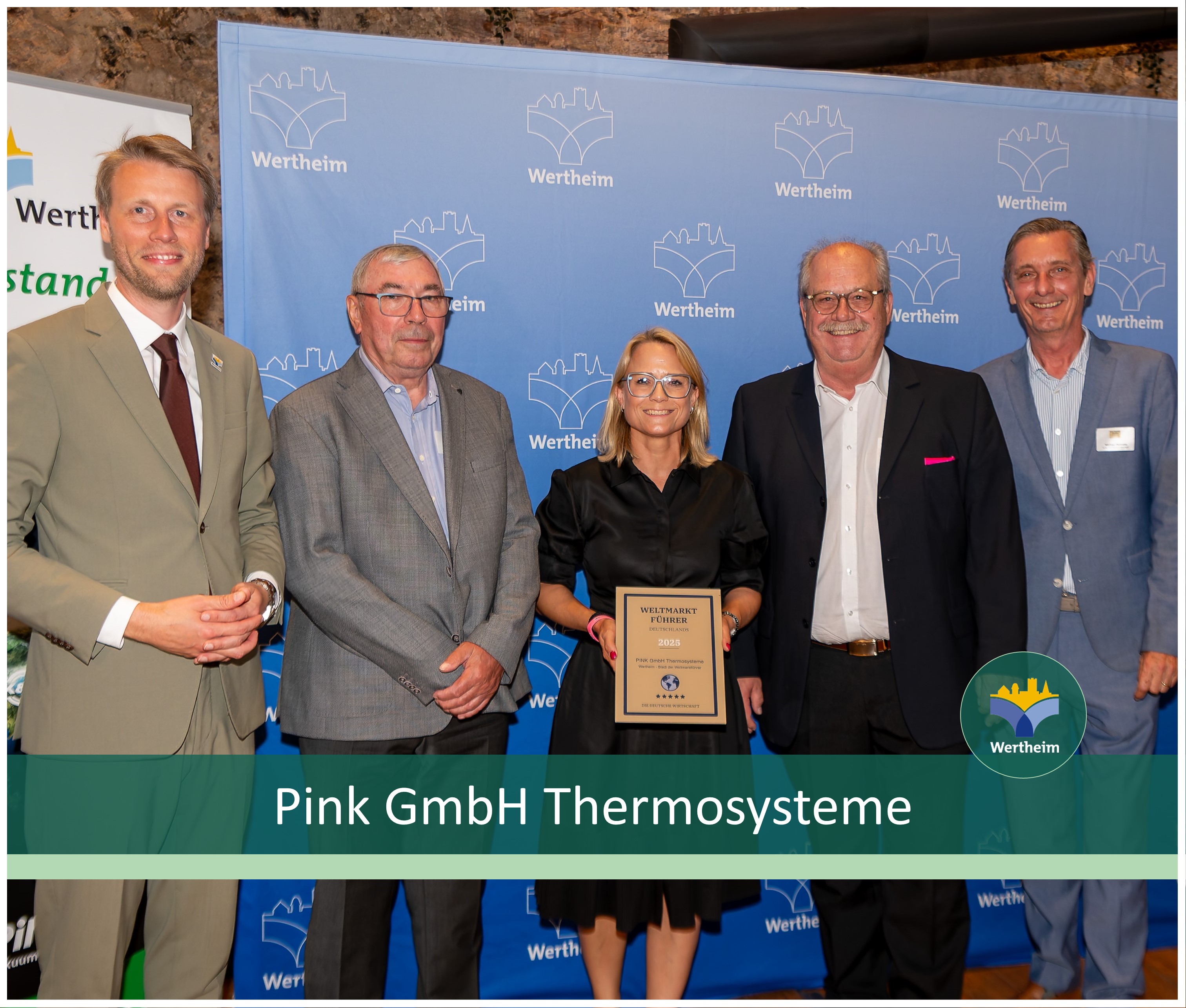 Aus Anlass der Aufnahme der Pink GmbH Thermosysteme ins Lexikon der deutschen Weltmarktführer fand eine Feierstunde zur Auszeichnung der nunmehr zwölf Weltmarktführer am 30. Juni 2025 auf der Wertheimer Burg statt. Oberbürgermeister Markus Herrera Torrez und Michael Oelmann, Herausgeber des Verlags „Die Deutsche Wirtschaft“ und damit des Lexikons der deutschen Weltmarktführer, zeichneten die Vertreter der zwölf Unternehmen mit dem Siegel „Weltmarktführer 2025“ aus. Die Veranstaltung brachte Persönlichkeiten aus Wirtschaft, Politik und Gesellschaft zusammen und unterstrich die herausragende Bedeutung der Wertheimer Unternehmen für die Region und darüber hinaus. Besonders gewürdigt wurden Innovationskraft, Standorttreue und generationsübergreifende Unternehmensführung. Die Berichterstattung zur Feierstunde (PDF | 949 KB) finden Sie hier. Auch der Fernsehsender L-TV hat über die Feierstunde einen Beitrag ausgestrahlt.