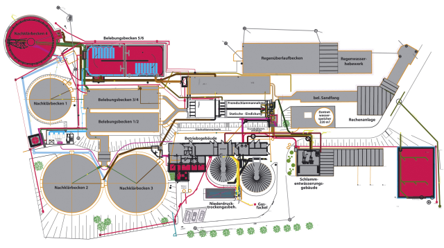 In dem komplexen Reinigungsprozess einer Kläranlage durchfließt das Abwasser hintereinander verschiedene Stufen. Rechenanlagen halten zu Beginn der mechanischen Reinigung Grobteile zurück. Im Sandfang und Vorklärbecken sinken Feststoffteile zu Boden, die Nährstoffe wie Stickstoff und Phosphor, die giftig für Fische sind und zu einer Überdüngung der Gewässer führen können, bilden in den Belebungsbecken für die Bakterien ein wahrhaftig gefundenes Fressen. In den Nachklärbecken sinken dann alle gelösten Teile zu Boden. Diese werden als Klärschlamm entwässert und umweltfreundlich verbrannt.
