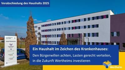 Der Etat steht unter dem Leitgedanken „Ein Haushalt im Zeichen des Krankenhauses: Den Bürgerwillen achten, Lasten gerecht verteilen, in die Zukunft Wertheims investieren“. Er hat ein Gesamtvolumen von 102,22 Millionen Euro.
