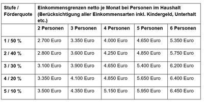 Zum Erhalt des Familienpasses gibt es drei Kriterien. Das wichtigste, weil die größte Zielgruppe umfassende, ist die einkommensabhängige Förderung für Familien, auch Alleinerziehende, mit mindestens einem Kind, gestaffelt nach der Zahl der Haushaltsmitglieder. Je nach Personenzahl und verfügbarem Nettoeinkommen ist eine Förderung zwischen höchstens 50 und mindestens zehn Prozent möglich. Ob eine Familie anspruchsberechtigt ist, kann sie anhand der neuen Einkommenstabelle prüfen. Zur Beantragung müssen die letzten drei Lohn-, bzw. Gehaltsabrechnungen (einschließlich November) vorgelegt werden.