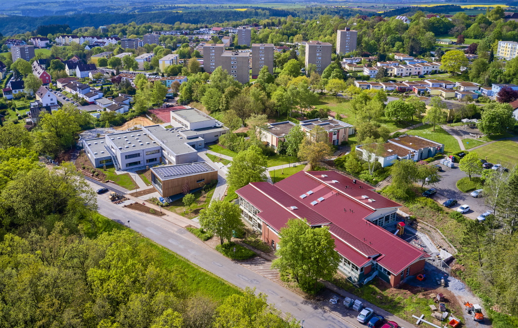 Die Neue Soziale Mitte und Teile des Stadtteils Wartberg aus der Vogelperspektive