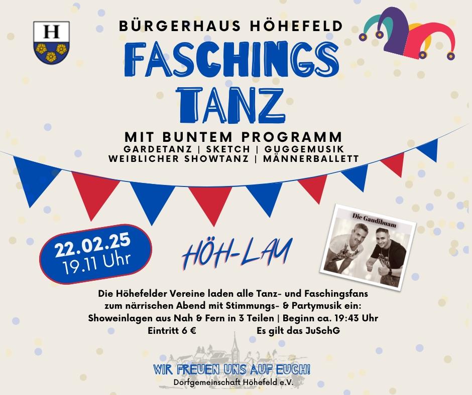 Die Dorfgemeinschaft Höhefeld lädt im Namen der Höhefelder Vereine alle Tanz- und Faschingsfans zum närrischen Abend mit Showeinlagen ein. Die Gäste erwartet ein buntes Programm aus Gardetanz, Sketch, weiblicher Schautanz, Männerballett sowie Guggemusik. Die 15 Tanz- und Unterhaltungsgruppen kommen aus Reicholzheim, Tauberbischofsheim, Urphar, Großrinderfeld, Gerchsheim, Külsheim, Hardheim, Werbach, Boxberg, Wertheim, Dörlesberg und Höhefeld.
