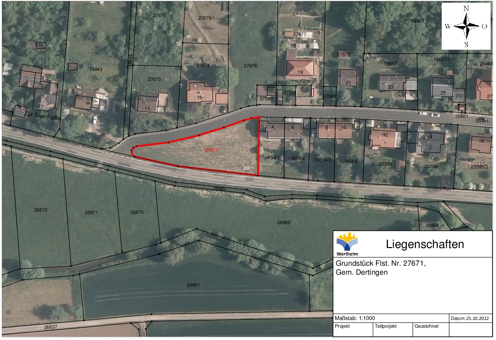 Das Grundstück liegt in der Straße Zur Steinhelle am Ortsausgang Dertingen Richtung Wüstenzell.
