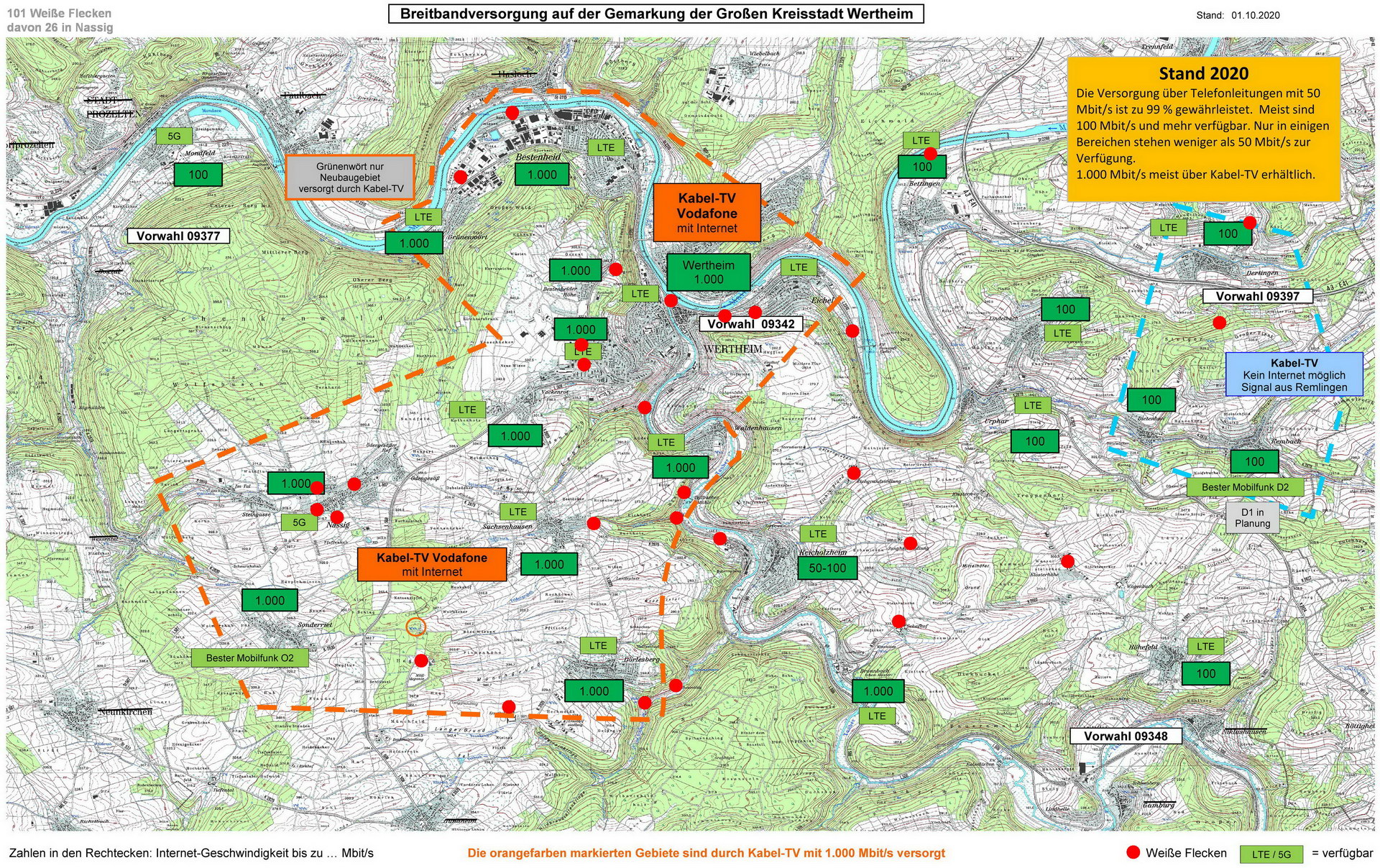 Im Rahmen des Breitbandausbaus im Main-Tauber-Kreis in den Jahren 2017 - 2019 durch die interkommunale Kooperation zwischen dem Landkreis und allen kreisangehörigen Gemeinden blieben in Wertheim rund 100 Adressen unterversorgt. Diese Adressen wurden im Rahmen des Projektes "Weiße Flecken" im Auftrag der interkommunalen Kooperation unter Federführung des Landratsamtes mit Glasfaser an das Internet angebunden. Die Große Kreisstadt Wertheim hat 99.000 Euro zu dem Projekt beigetragen. Nach zweijähriger Bauzeit ging dieses Glasfasernetz in Betrieb. Die Organisation und Vermarktung übernimmt die Fa. SÜC // DACOR GmbH aus Coburg, einer Tochterfirma der dortigen Stadtwerke.