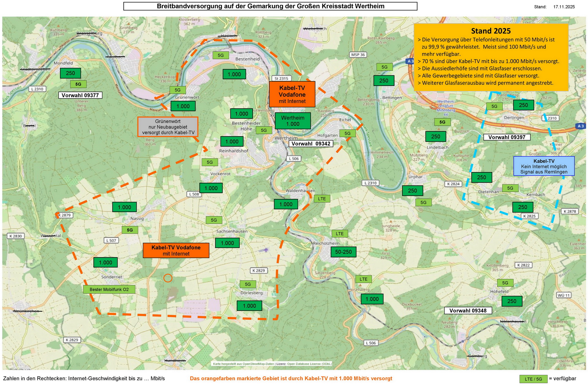 | Bestenheid, bis 1.000 Mbit/s | Bronnbach, bis 1.000 Mbit/s | Mondfeld, bis 250 Mbit/s |