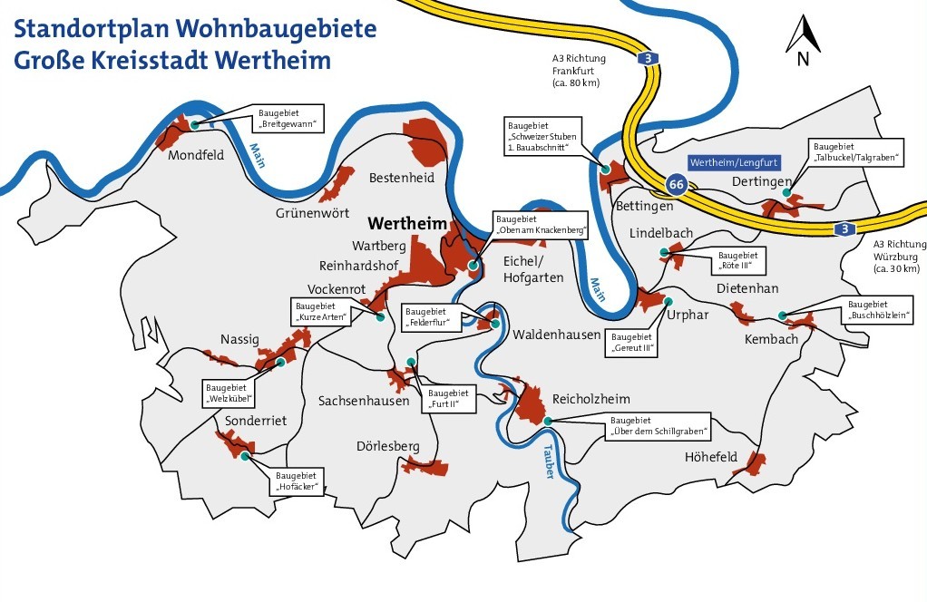 Die Stadt Wertheim bietet eine große Auswahl attraktiver Bauplätze. Sowohl in den fünf Stadtteilen, als auch in den 15 Ortschaften gibt es bestehende, im Bau oder in der Planung befindliche Wohnbaugebiete. Diese bieten idyllisches Wohnambiente, mitten in der Natur und eingebettet in eine lebendige Dorfgemeinschaft.
